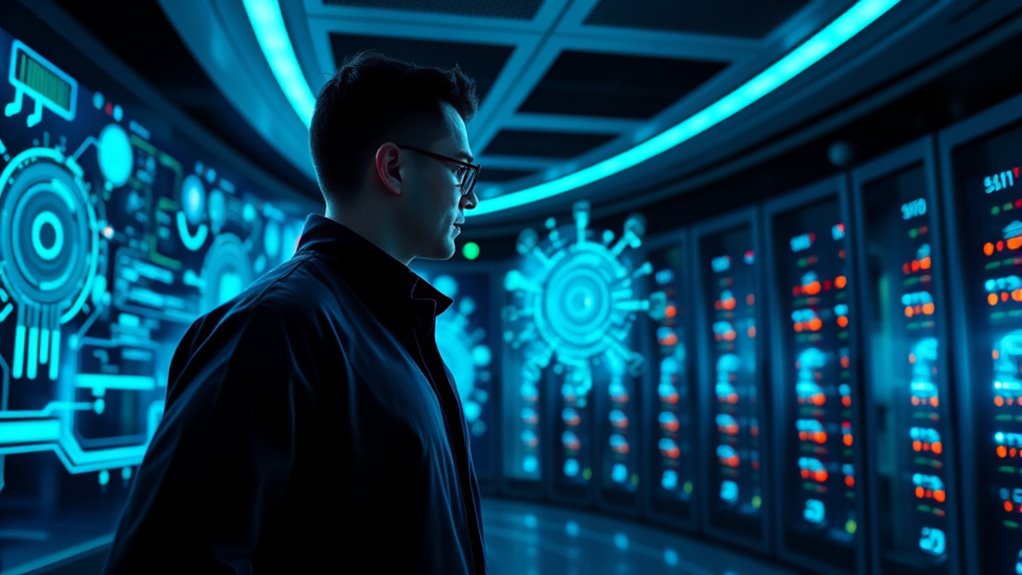 What makes AI particularly effective in threat detection and anomaly detection is its ability to learn and adapt. As cybercriminals develop new tactics, AI models evolve through continuous training, staying ahead of emerging threats. This adaptability guarantees your security measures remain robust even as attack methods become more sophisticated. Plus, AI can process data at a scale and speed that humans simply can’t match, enabling you to detect threats in real-time and respond without delay.