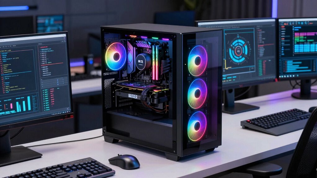 Certain AI workloads, like training large deep learning models or working with massive datasets, demand more than 32GB RAM. Your AI hardware needs to support these intensive tasks, and memory optimization becomes essential to prevent bottlenecks. When planning your setup, consider future scalability and the possibility of higher memory requirements, ensuring your system can handle evolving AI workloads efficiently without frequent upgrades.