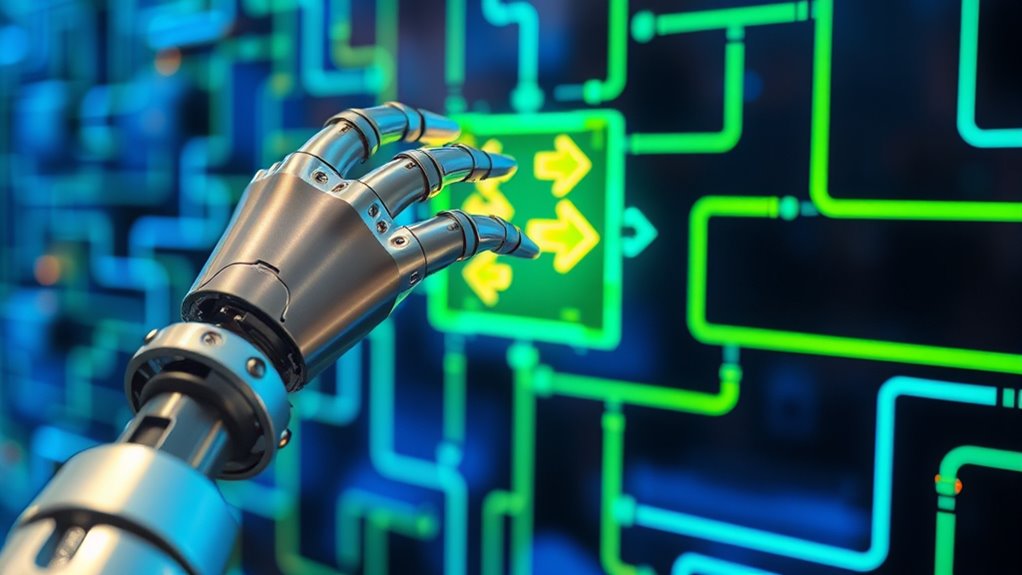 Reinforcement learning teaches AI systems to make decisions by learning through trial and error, similar to how humans and animals learn from experience. It uses neural networks to interpret complex data, and rewards guide the system toward better actions. As it explores different strategies, the AI improves over time, developing effective solutions even in unpredictable environments. Keep exploring, and you’ll discover how this approach allows machines to become smarter and more adaptable.