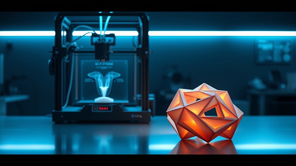 The evolution of 3D printing is accelerating thanks to advancements in AI technology. You now have access to smarter, faster, and more dependable manufacturing processes that push the boundaries of what’s possible. Generative AI, for example, automates the creation and enhancement of 3D models from basic parameters. Instead of spending hours on manual design work, you can input simple guidelines, and AI will generate complex, refined models ready for printing. This not only saves time but also enhances precision, enabling you to produce intricate parts with less effort. Meanwhile, AI-powered slicing software dynamically adjusts layer thickness and printing parameters during the process. It guarantees ideal material use and structural strength by responding in real-time to the model’s needs, reducing waste and improving overall quality. AI-driven process monitoring analyzes sensor data during printing to detect anomalies instantly. Predictive algorithms analyze your 3D models before printing even begins, highlighting potential errors and suggesting adjustments to avoid failures. This streamlines your workflow, minimizes trial-and-error, and results in higher success rates. As AI models become more specialized and enterprise-grade, their integration into automated design processes becomes smoother, making advanced features accessible even for smaller teams. The rise of ChatGPT and similar AI solutions reflects a growing demand for user-friendly interfaces that make complex design automation straightforward, allowing you to focus more on creative and strategic tasks rather than technical minutiae. During the printing process, AI systems continuously analyze sensor data to detect deviations or defects as they happen. This real-time monitoring lets you correct issues immediately, preventing wasted material and reducing post-production inspection. Technologies like Nikon’s 3D metrology leverage advanced imaging methods—such as fringe scanning, interferometry, and X-ray—to inspect each layer during printing, ensuring the highest standards of accuracy. Anomaly detection systems serve as your digital quality control, instantly flagging issues and prompting corrective actions, especially critical in sensitive fields like aerospace and healthcare, where precision is non-negotiable. Utilizing vertical storage solutions in your design workspace can help maintain a clutter-free environment, allowing for better focus and creativity in your projects. AI also democratizes 3D printing by automating complex tasks like design adjustments, slicing, and post-processing. This lowers the barrier to entry, enabling more industries—dental, aerospace, jewelry—to adopt additive manufacturing. Automation of CAM steps and intuitive knowledge management tools empower you to troubleshoot and learn on the fly with natural language prompts, accelerating onboarding and scaling operations. Robotics further enhance this ecosystem by handling part removal, post-processing, and material delivery, reducing human error and labor costs. Hybrid manufacturing lines marry additive and subtractive processes, with robots switching seamlessly between tasks, boosting efficiency. In healthcare, AI-driven 3D printing of vascular tissues and dental restorations continues to grow, resulting in better patient outcomes and more personalized solutions. This synergy between AI and 3D printing is transforming manufacturing into a highly precise, efficient, and accessible industry. You’re now equipped with tools that make complex production faster, more reliable, and more innovative than ever before.