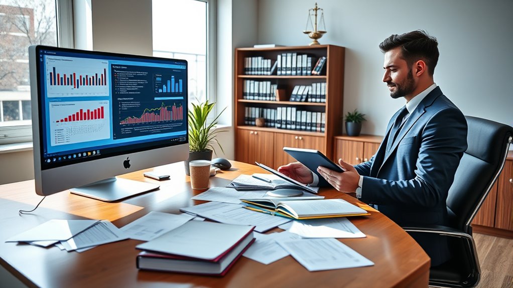 AI delivers clear returns for your small legal office by automating administrative work, streamlining legal research, and assisting with document drafting. This boosts your productivity, allowing you to focus on high-value tasks and increase revenue without extra overhead. Most small firms already see these benefits, with AI adoption growing rapidly. As ethical concerns decrease and familiarity rises, integrating AI can give you a competitive edge—keep exploring to discover how you can maximize its potential.