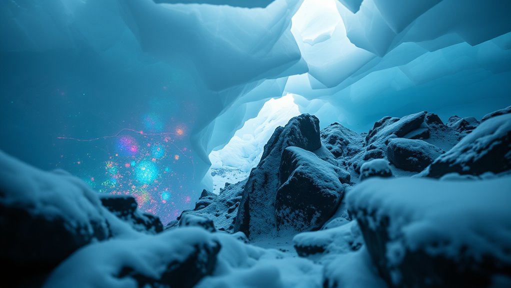Artificial intelligence is revealing the complex and resilient microbial ecosystems hidden beneath Antarctica’s ice by analyzing data from remote sensors, genetic sequencing, and environmental measurements. It detects subtle shifts, uncovers new genes, and models how ecosystems respond to climate change. This technology helps scientists understand how life survives in extreme conditions and shapes conservation efforts. Keep exploring to discover how AI continues to uncover the secrets of these fragile, yet essential, ecosystems.