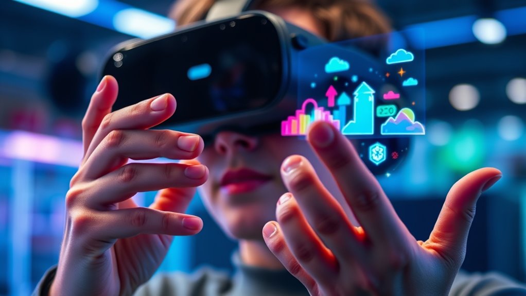 Virtual reality creates fully immersive experiences by replacing your surroundings with a simulated environment, making you feel like you’re really there. Augmented reality, on the other hand, overlays digital elements onto your real-world view through devices like smartphones or glasses. You experience seamless technology integration in AR while still interacting with your actual environment. VR immerses you completely, whereas AR enhances reality without disconnecting you from it.