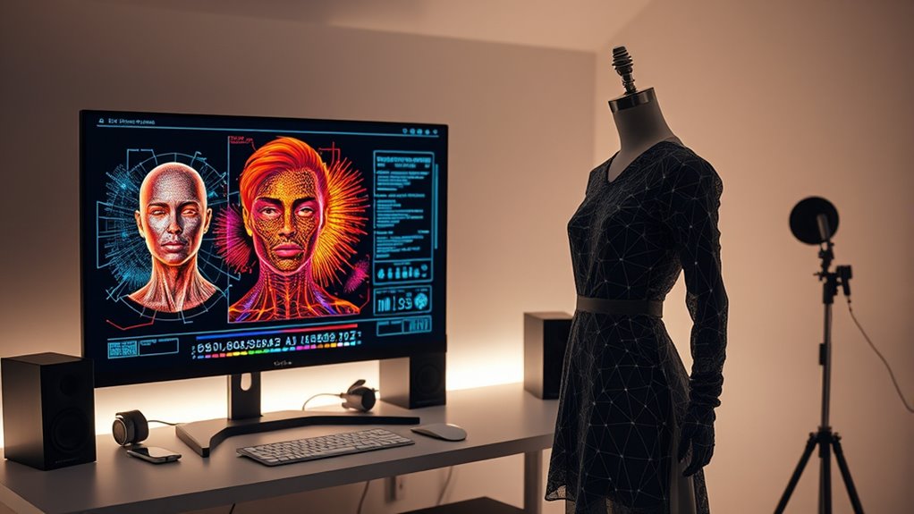 AI now analyzes brain signals like EEG to quantify human attraction, turning neural responses into personalized art and apparel. It detects patterns linked to romantic interest, allowing for tailored images and experiences based on subconscious preferences. Through machine learning and neural feedback, AI can predict attraction and create customized designs that mirror genuine emotional responses. Keep exploring how this innovative tech transforms personal expressions of attraction into unique artistic and fashion elements.