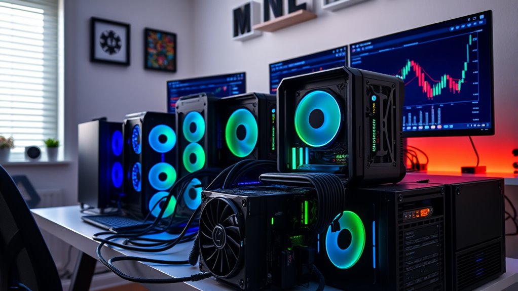 Setting up your mining hardware requires a bit of technical know-how. You’ll need to connect your devices to a power source, install mining software, and join a mining pool if you decide not to mine solo. Joining a pool increases your chances of earning consistent rewards, although the payout will be shared among members. Make sure your hardware is properly cooled, as mining generates heat that can shorten the lifespan of your equipment if not managed well. Proper ventilation and cooling solutions are vital to keep everything running smoothly and to avoid overheating. Additionally, understanding the role of contrast ratio in your setup can help you optimize your hardware performance for better efficiency.