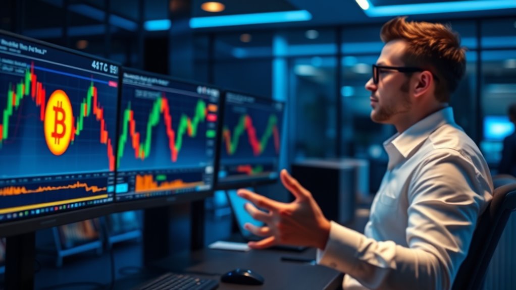 The FOMC influences Bitcoin’s short-term price movements mainly through its interest rate decisions and tone. If the Fed adopts a dovish stance, signaling lower rates or a pause, you’ll likely see Bitcoin rally as liquidity increases. Conversely, hawkish signals or rate hikes can trigger declines, as investors seek safer assets. Keep an eye on their statements, as they can quickly shift market sentiment and cause rapid price swings.