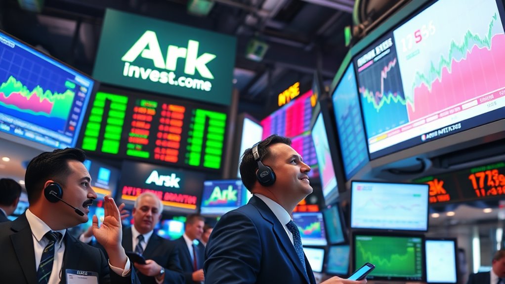 When Ark Invest makes heavy purchases upon debut, it often triggers sharp bullish pops in stocks. Their concentrated bets on high-growth sectors like biotech and clean energy attract momentum traders and boost investor enthusiasm. These moves create short-term surges, signaling institutional confidence and attracting further buying. If you want to understand how these large trades drive market momentum and shape short-term trends, there’s more to explore about these dynamic market plays.