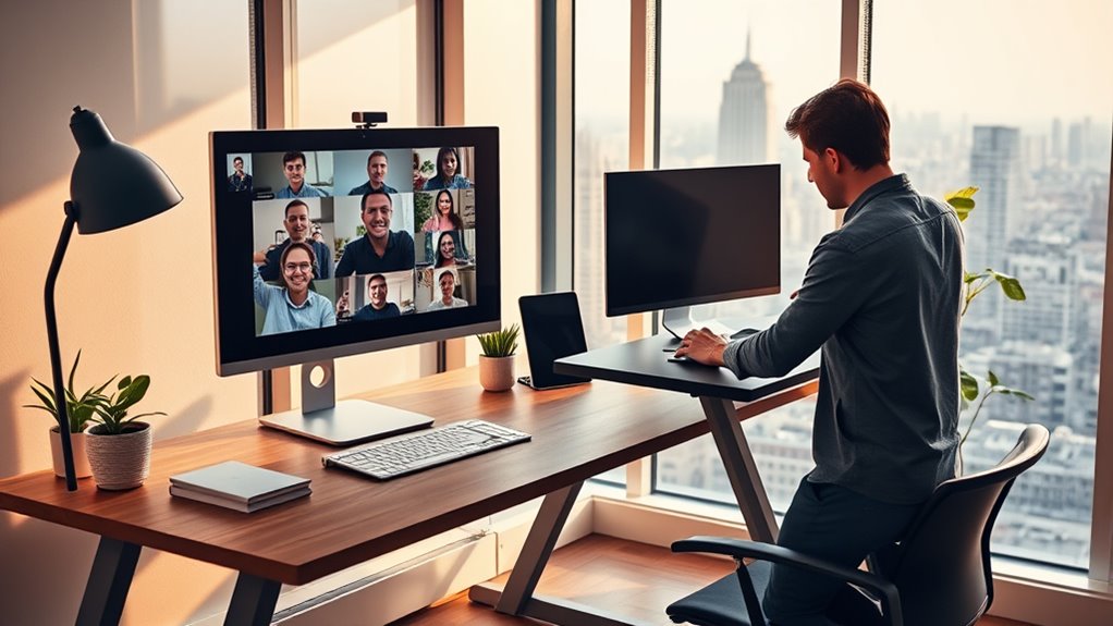 Managing change in remote and hybrid work environments requires fostering employee adaptability through open communication, extensive training, and involving staff in decision-making. Support emotional resilience by creating a positive, transparent atmosphere, celebrating small wins, and addressing concerns promptly. Utilize technology effectively with phased rollouts and ongoing assistance. Promoting dialogue and flexibility helps teams shift seamlessly and turn change into an opportunity for growth. Continuing to explore these strategies will give you more tools to lead successfully.