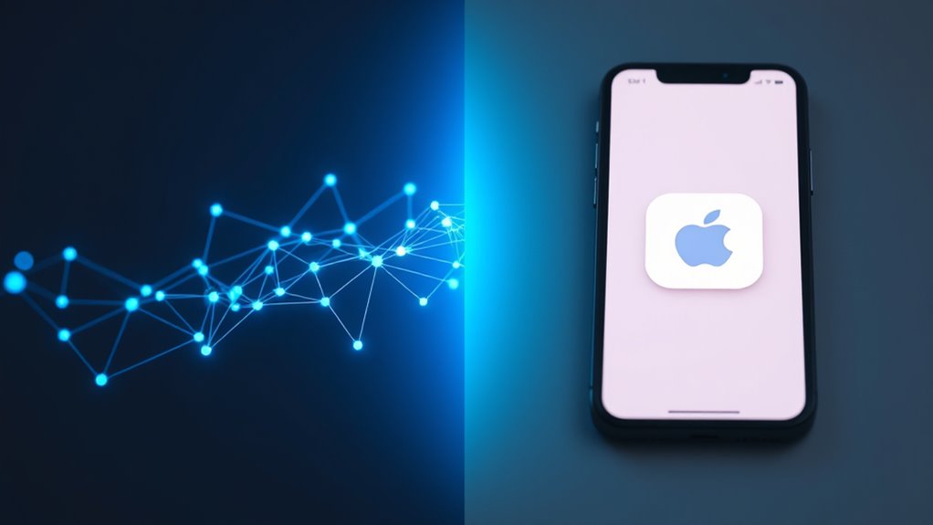 Dapps differ from traditional apps mainly in how they operate and handle data. With Dapps, smart contracts automate processes on a blockchain, offering transparency, enhanced privacy, and a lack of central control, which builds trust. Traditional apps depend on centralized servers, making them easier to update but more vulnerable to breaches and censorship. Understanding these differences helps you see why Dapps focus on decentralization and security, a topic you’ll find more details on if you explore further.
