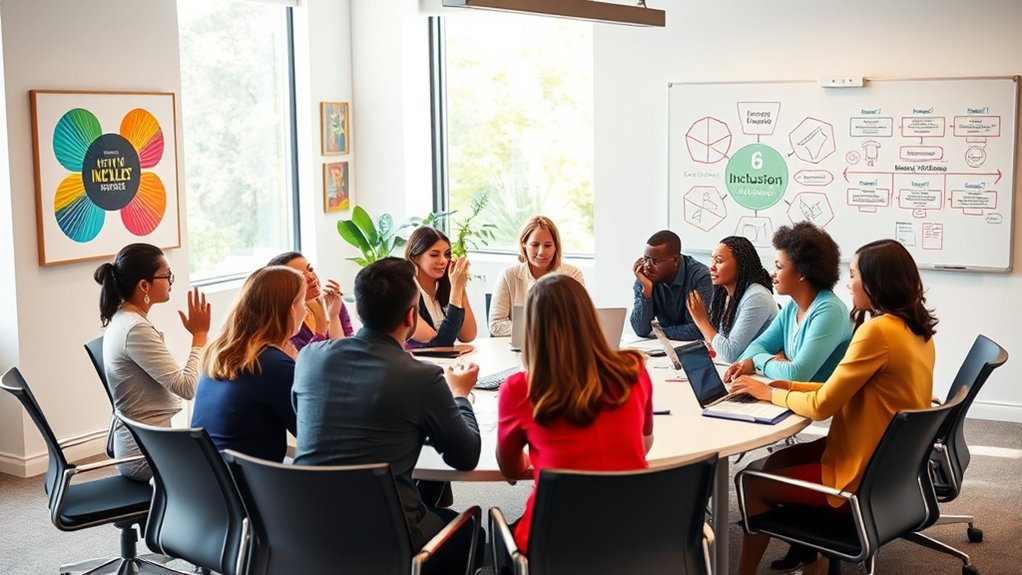 Inclusive leadership is another critical focus of diversity and inclusion training. It’s about developing leaders who actively promote diversity at every level and foster an environment where all voices are heard. When you adopt inclusive leadership principles, you learn how to encourage participation from diverse perspectives, which enhances problem-solving and creativity. This type of leadership isn’t just about managing teams effectively; it’s about creating a safe space where differences are celebrated and every team member feels they belong. As you develop these skills, you’re better equipped to challenge exclusionary behaviors and support underrepresented groups. Inclusive leadership also involves setting an example—being transparent about diversity goals, listening actively, and holding yourself accountable. By doing so, you influence others to follow suit, gradually embedding inclusivity into your organization’s fabric.