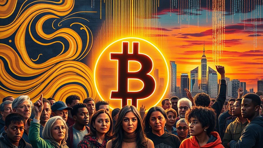 Bitcoin isn’t just about money; it’s a movement for your financial freedom. Think of it like a ripple spreading outward, challenging old systems and empowering you to take control. As more people adopt it, the idea grows stronger—like a wave building momentum. This isn’t just theory; it’s a visual of collective resistance, showing how individual actions can reshape the future of finance, one transaction at a time.
