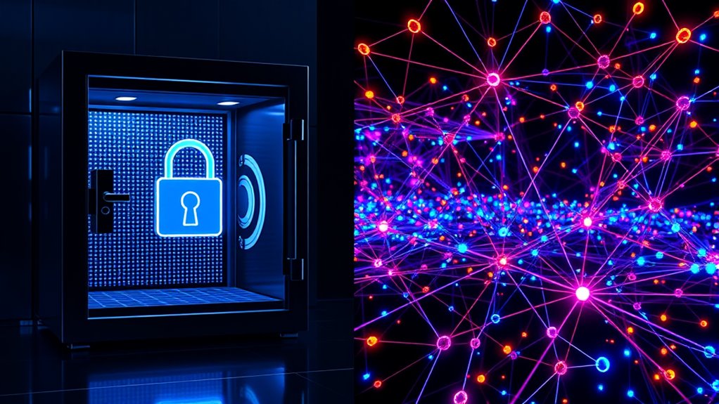 Permissionless blockchains let anyone join and participate without approval, offering full transparency but raising privacy concerns. In contrast, permissioned blockchains restrict access to selected entities, providing greater privacy, control, and faster transaction speeds. These differences impact their suitability for various applications—public cryptocurrencies versus enterprise solutions. Understanding how consensus mechanisms and accessibility shape security and efficiency will help you choose the right type. Keep exploring to uncover more about their unique features and use cases.