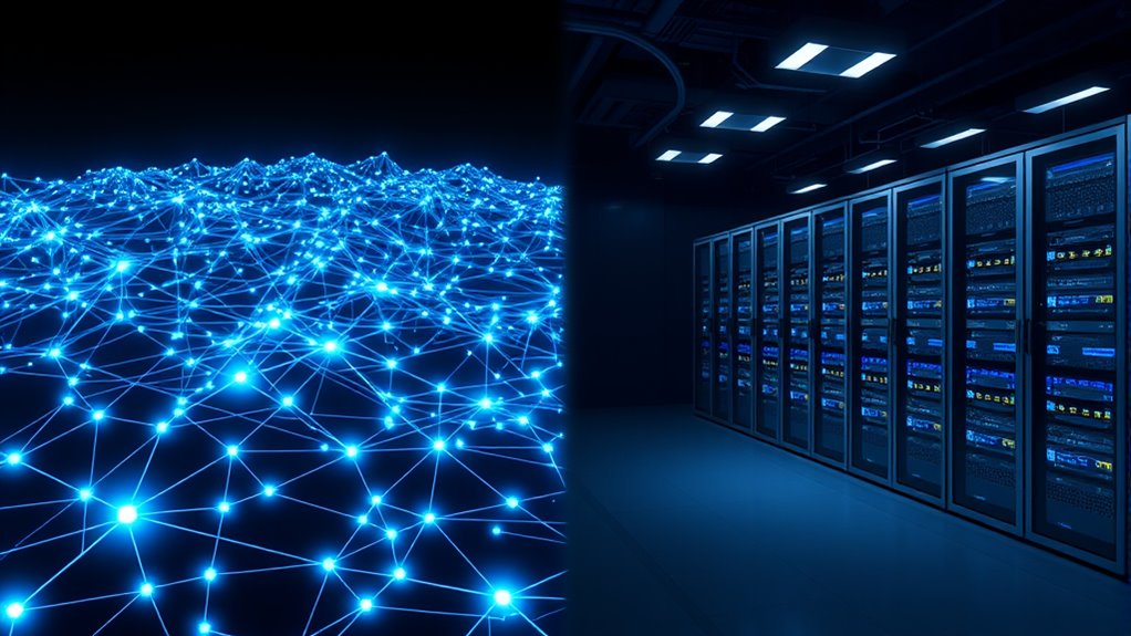 You’ll find that consensus algorithms differ between public and private blockchains because public ones rely on trustless models like proof of work or proof of stake, ensuring security without a central authority. Private blockchains, however, use more permissioned consensus mechanisms like practical Byzantine Fault Tolerance, which depend on established trust among participants. This makes private blockchains faster and more efficient, while public ones prioritize decentralization and security.