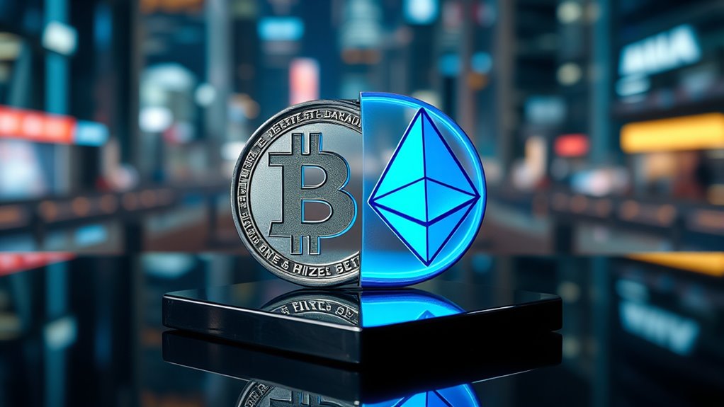 Many see Ethereum and Bitcoin as rivals, but they actually serve different purposes and complement each other. Bitcoin acts as a decentralized store of value and medium of exchange, emphasizing stability and security. Ethereum, on the other hand, is a platform for smart contracts and decentralized applications, fostering innovation. Their contrasting goals and development styles mean their relationship is less about competition and more about coexistence—if you’re curious, there’s more to uncover about how they truly compare.