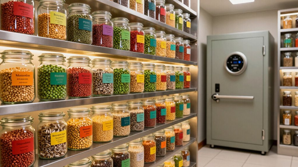 Remember, storing seeds isn’t just about finding a fireproof safe—it’s about creating a resilient fortress for your future crops. Think of your seed backup as a delicate treasure chest, requiring careful handling, proper environment, and regular check-ins. By staying vigilant and proactive, you’ll guarantee your seeds remain healthy and viable, ready to flourish when needed. With the right care, your seed vault can be as steadfast as a seasoned oak in a storm.