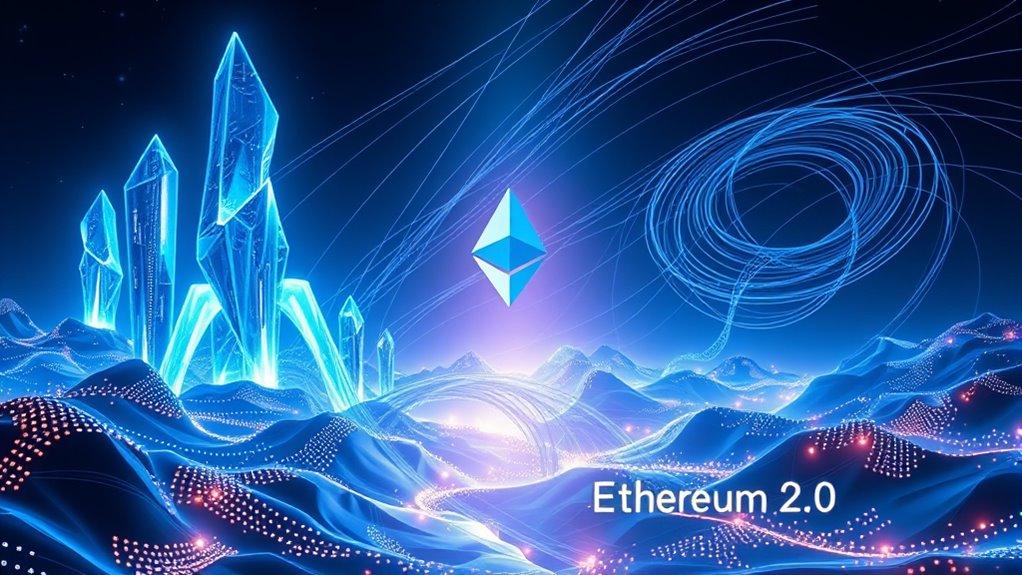 The Ethereum 2.0 merge means the network has shifted from proof-of-work, which used lots of energy, to proof-of-stake, making it more sustainable and environmentally friendly. This change reduces energy use, lowers costs, and helps prevent network congestion. It also prepares Ethereum for future upgrades like sharding, enabling faster and cheaper transactions. To see how these improvements can impact you and the future of Ethereum, keep exploring further.