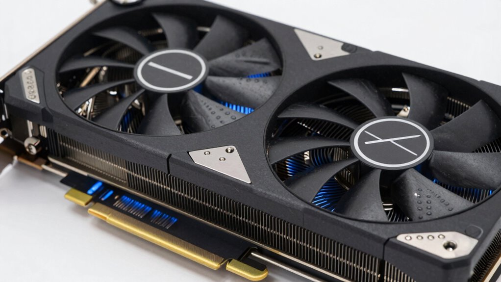 Manufacturing innovations like advanced heat pipe designs and improved fan blade geometry are transforming Radeon cooling systems. These tweaks help reduce noise while maintaining ideal performance. By using innovative thermal interface materials, manufacturers guarantee quieter operation without sacrificing cooling efficiency.