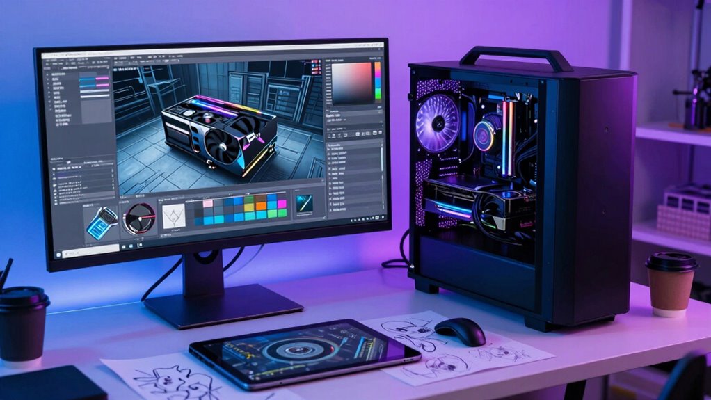 You’ll find Radeon GPUs often cost less than comparable NVIDIA cards, especially when considering graphics card pricing, making them attractive for budget-conscious creators. However, consider creative software compatibility, as some programs work better or are optimized for NVIDIA’s CUDA technology. While Radeon offers good performance for many tasks, if your workflow relies heavily on software with NVIDIA-specific features, the price difference might not justify the switch.