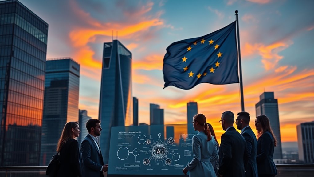 Europe aims to shape its AI future by balancing innovation, ethical standards, and geopolitical influence. They’ve launched a thorough strategy focusing on building infrastructure, managing data, and fostering skills, all while regulating AI to guarantee trustworthiness. Their goal is to reduce dependence on foreign technologies and set global standards that emphasize trustworthy, human-centric AI. As you explore further, you’ll discover how Europe’s approach impacts global AI leadership and governance.