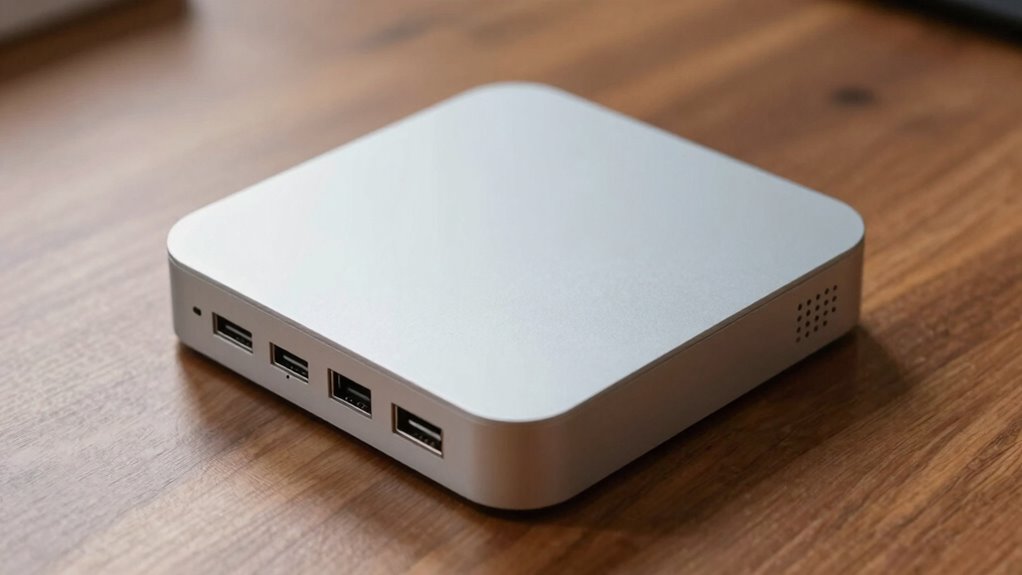 Think of external hubs and port expanders as bridges connecting your mini PC to a world of peripherals. They’re the best solutions for expanding your ports, offering multiple USBs, HDMI, and Ethernet options in a compact form. External hubs are plug-and-play, while port expanders often connect via Thunderbolt or USB-C, giving you quick, reliable access to all your devices without overcrowding your mini PC’s limited ports.
