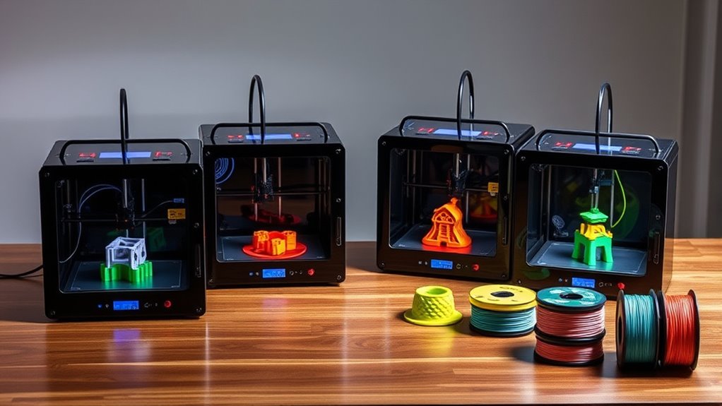 If you’re looking for the best 3D printers under $500 in 2025, I’ve found several great options that combine affordability with quality. Models like the FlashForge Adventurer 5M, Creality Ender 3 V3 Plus, and FLASHFORGE AD5M Pro offer features like auto-leveling, large build volumes, and high-speed printing for hobbyists and beginners. These printers deliver reliable, detailed results without breaking the bank. Stick around to discover more about these top-rated, budget-friendly 3D printers that won’t compromise on performance.