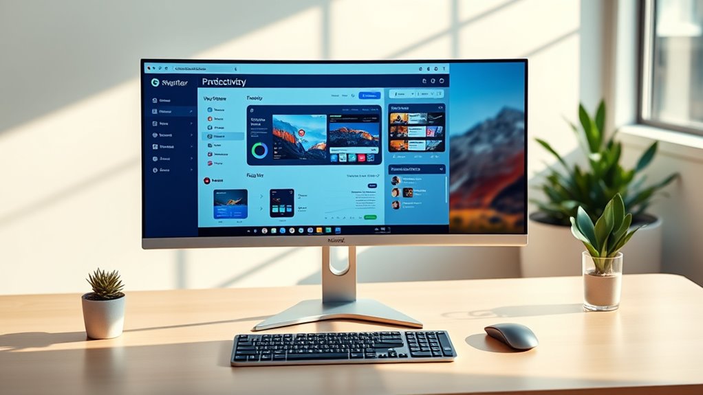 If you want to boost your workspace in 2025, I recommend exploring some of the best 4K monitors on the market. You’ll find options that combine stunning visuals, accurate colors, and versatile connectivity, perfect for multitasking and creative work. Whether you prefer a sleek professional model or a high-performance gaming monitor, there’s plenty to choose from. Keep going, and you’ll discover all the key features that make these monitors ideal for productivity.