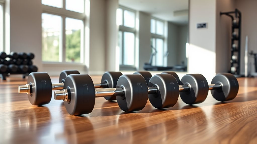 Safety features play a vital role in guaranteeing your workouts remain secure and injury-free. Adjustable dumbbells with double-locking mechanisms, safety locks, or locking pins prevent plates from slipping during lifts, reducing the risk of accidents. Many models include quick-release or twist-lock systems that secure weights firmly, giving you confidence during intense sessions. Anti-slip grips and ergonomic handles provide a secure hold, especially with heavier weights, minimizing slips that could cause injury. Some dumbbells feature anti-fall or anti-shock designs to lessen injury if dropped. Regular inspection and maintenance of locking systems are essential to keep safety features effective over time. Prioritizing these safety mechanisms ensures a safer, more reliable workout experience at home.