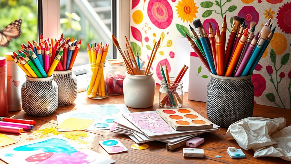 To select age-appropriate art supplies for your child, I consider their age, safety, and skill level. I look for non-toxic, washable, and durable tools that suit their developmental stage. For younger kids, I pick chunky crayons and large brushes, while older children can handle finer pens and paints. I also check for clear labels and safety certifications to guarantee everything is safe and suitable for their age.