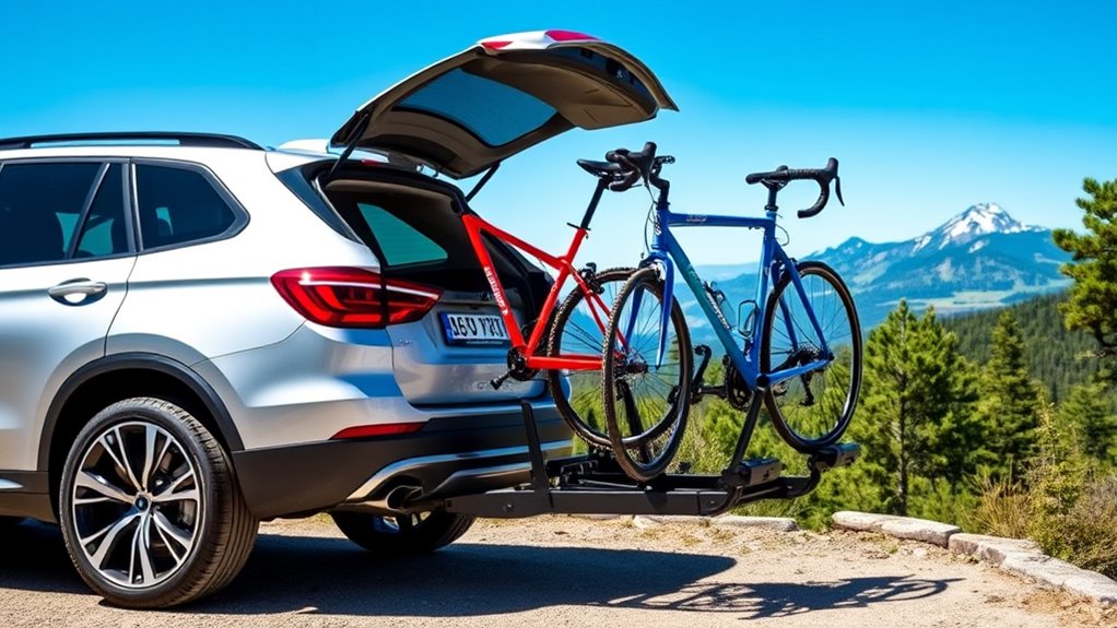 Security features are vital when it comes to keeping your bikes safe during transport. Locking mechanisms for both the bikes and the rack help prevent theft while you’re on the road or parked. Anti-sway hardware and straps minimize bike movement, ensuring they stay securely in place and reducing potential damage. Reinforced hitch locks and anti-theft cables add extra layers of security, making unauthorized removal difficult. Padded clamps and soft contact points protect your bikes from scratches without sacrificing stability. Some racks even include security alarms or integrate with your vehicle’s system to alert you of tampering. These features give me peace of mind, knowing my bikes are well-protected, whether I’m driving across town or leaving my car unattended.