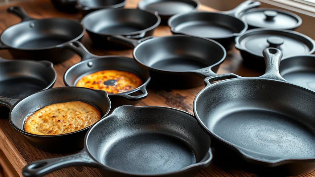 When selecting a cast iron skillet, understanding the balance between price and value is essential to making a smart investment. Prices vary widely, from budget options around $20 to handcrafted pieces over $200, depending on size, brand, and craftsmanship. Larger skillets or those with special features like enamel coatings or vintage designs tend to cost more but can offer added benefits. Pre-seasoned skillets often come at a higher initial price, but they deliver better non-stick performance and require less maintenance, which can justify the cost. Investing in a high-quality, durable skillet may seem expensive upfront, but it saves money over time by lasting for decades. Mid-range options often provide the best performance-to-cost ratio, making them a smart choice for everyday use.
