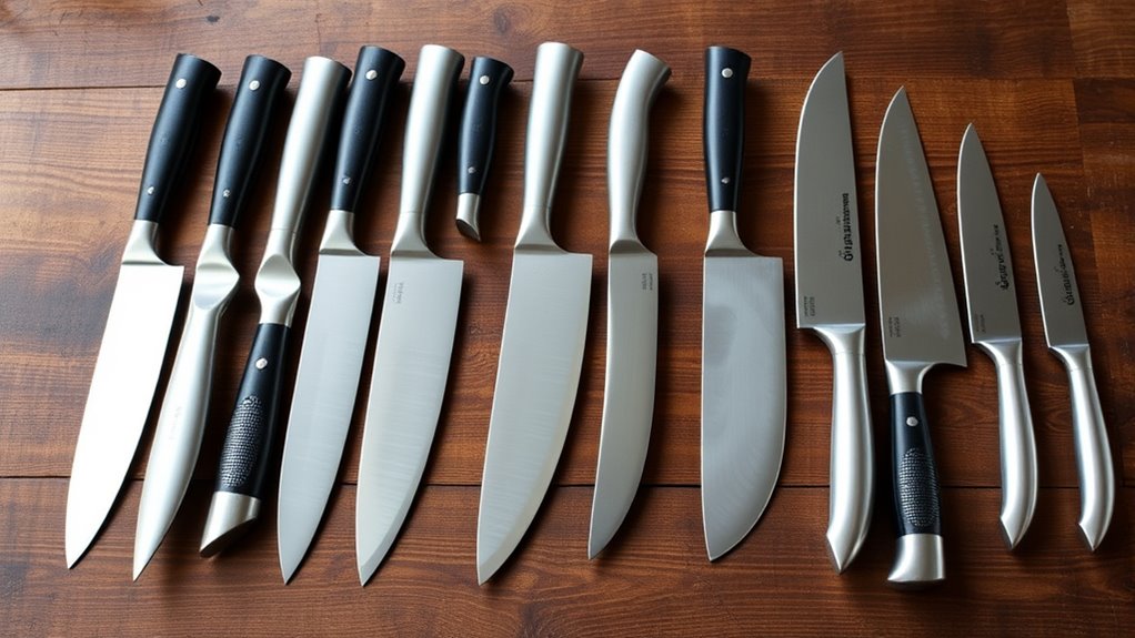 Stainless steel knives resist rust and corrosion, making them low-maintenance and ideal for everyday use. High-carbon steel knives, on the other hand, are sharper and hold their edge longer, but they’re prone to rust if not properly cared for. I prefer high-carbon for precision, but stainless steel is forgiving. Ultimately, your choice depends on how much upkeep you’re willing to do and your cutting needs.