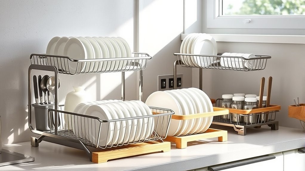Choosing the right dish drying rack is like selecting the perfect garden trellis—each offers a unique support system for your needs. Think of your kitchen as a vibrant garden, where a sturdy rack helps your dishes flourish and dry effortlessly. When you pick one that fits your space and style, it’s like planting a reliable trellis that makes your kitchen bloom with organization and ease. Happy drying!