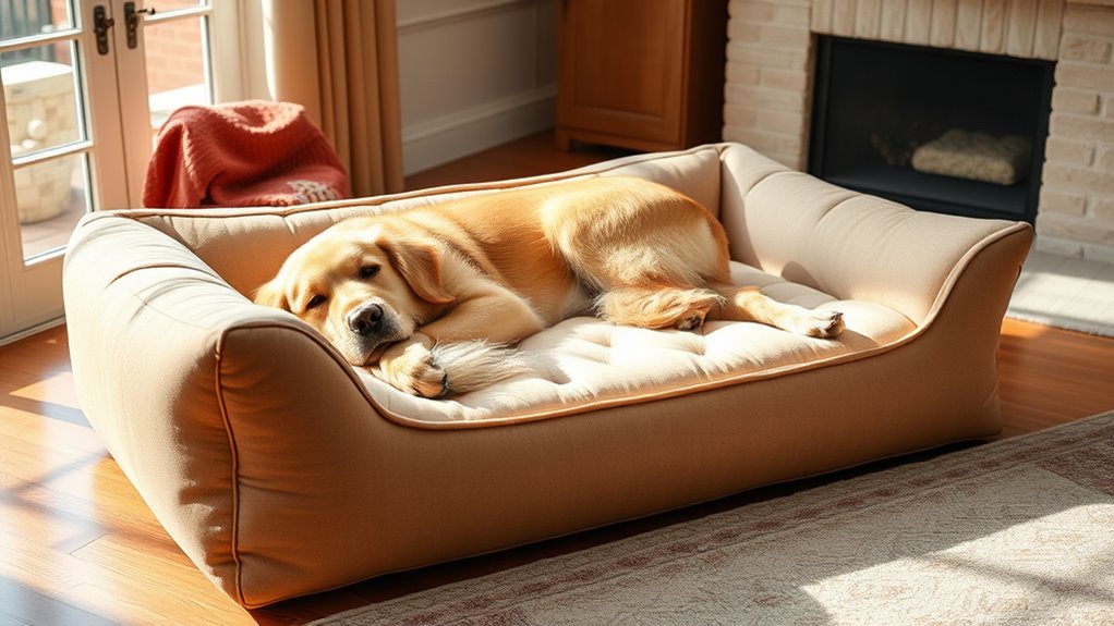 Selecting a dog bed that provides proper support and comfort is vital for large dogs, especially since their joints and bones bear more weight. I recommend choosing orthopedic or high-density foam beds to guarantee adequate support. A supportive bed should also have reinforced edges or bolsters, offering a cozy spot for your dog to rest its head and feel secure. Proper support helps alleviate common issues like arthritis, hip dysplasia, and joint stiffness. The thickness of the foam or padding is essential—look for at least 3 inches to prevent sinking and promote even weight distribution. Additionally, comfort features like plush surfaces, supportive bolsters, and the right size contribute to restful sleep and overall well-being for your large breed.