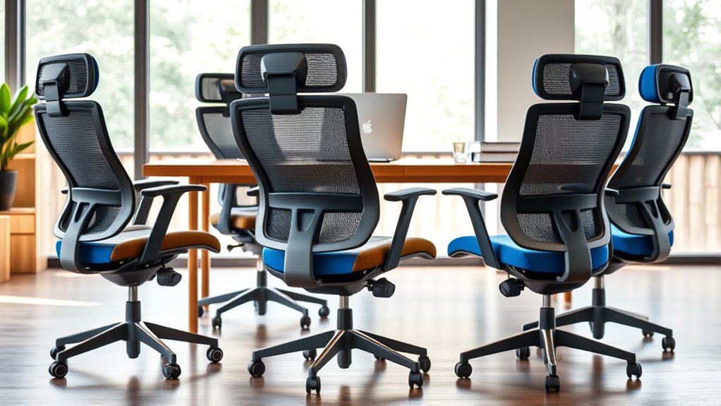 Are you making sure your office chair offers the right support and comfort for long hours? Look for a chair with adjustable lumbar support to match your back’s natural curve and reduce lower back strain. Multiple ergonomic features like adjustable seat height, backrest tilt, and armrest positioning let you customize your seating for maximum comfort. Adequate padding and support are essential so you can sit comfortably without pressure points during extended use. Choose breathable materials like mesh or ventilated fabric to promote airflow and prevent heat buildup. Also, check that the chair’s weight capacity and seat dimensions suit your body size, ensuring stability and proper support. Prioritizing these factors helps you find a chair that keeps you comfortable and supported all day.
