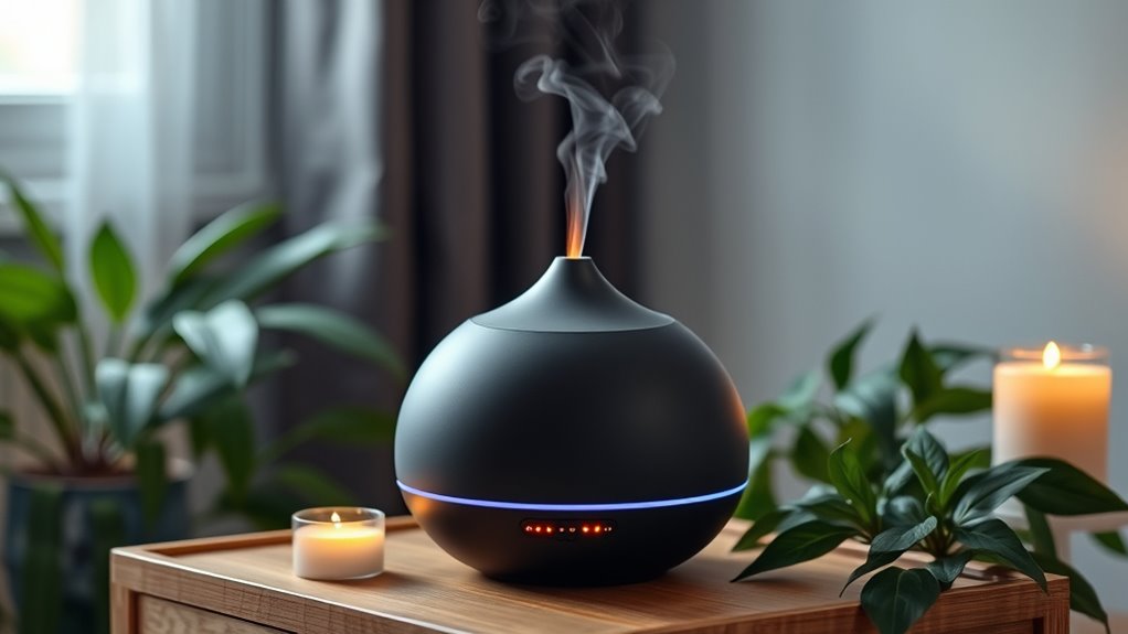 Auto shut-off features are essential for ensuring safe and worry-free operation of your essential oil diffuser. They prevent overheating and damage by automatically turning off when water runs low or if the device gets too hot. This safety measure reduces fire risks and helps protect your investment. Most diffusers with auto shut-off activate when water levels are low, allowing for unattended use—perfect for overnight or busy days. Safety certifications often require auto shut-off as a standard feature, giving you extra confidence in the product’s reliability. To maintain safety, it’s important to regularly check that the auto shut-off is functioning properly. Doing so prolongs your diffuser’s lifespan and keeps you and your home safe during every use.