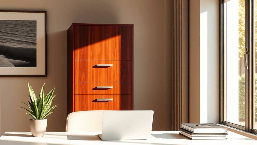 I find that steel and solid wood are the most durable materials for long-term home office use. Steel cabinets are sturdy, resistant to impacts, and offer great security, making them ideal for frequent access. Solid wood, especially hardwoods like oak or maple, provides durability and a classic look that ages well over time. Both materials guarantee your files stay protected and intact for years, even with daily use.