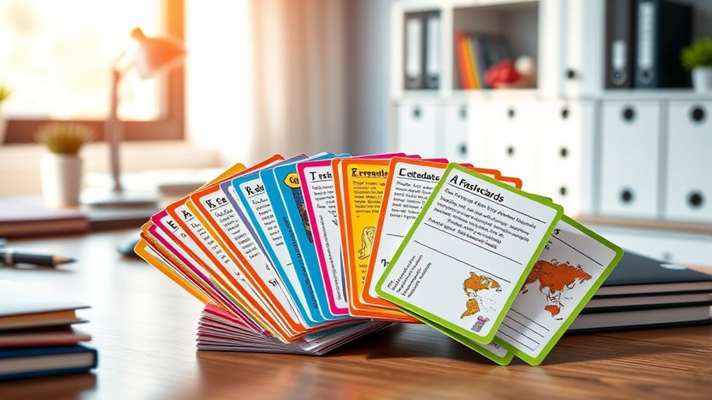 Organizing flashcards effectively can make a big difference in how smoothly your learning sessions go. I recommend choosing sets that include organizational tools like binder rings, storage boxes, or sleeves, so your cards stay tidy and accessible. Look for sets with clearly labeled categories or sections—this helps you quickly sort and target specific topics during review. Pay attention to the size and design of the cards; they should be easy to group or store without damage. Color-coding options or labels are also helpful for quick topic recognition and differentiation of skill levels. Ultimately, opt for durable, weather-resistant materials to confirm your organization remains intact over time, keeping your flashcards functional and easy to manage.