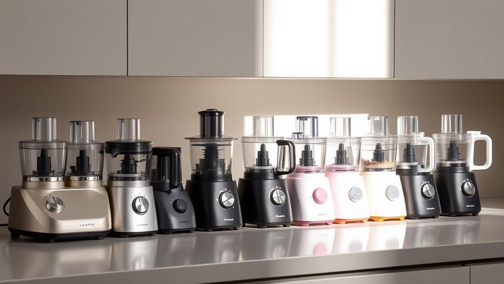 If you’re looking to save space in your kitchen, I recommend checking out the 14 best compact food processors for 2025. These models are designed to be small but versatile, with options like the KitchenAid KFC3516ER, Black+Decker’s mini chopper, and Hamilton Beach’s compact units. They’re perfect for quick prep tasks and fit neatly into tight spots. Stay with me to explore which one best suits your needs and how they can maximize your kitchen efficiency.