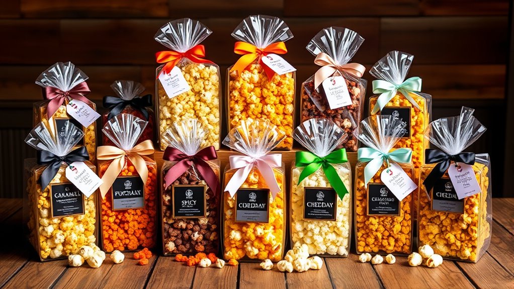 Many gourmet popcorn gift sets cater to vegan and gluten-free cravings, offering options that delight without dietary dilemmas. I’ve seen sets showcasing savory, seed-based snacks and sweet, soybean-based treats that satisfy every snacker’s standards. These thoughtfully curated collections guarantee everyone, regardless of dietary needs, can enjoy a delicious, dynamic popcorn experience. So, whether vegan or gluten-free, you’ll find fantastic, fuss-free gift sets that truly impress!