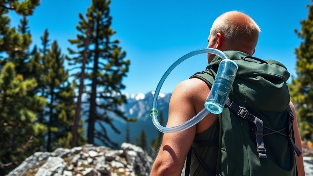 Insulation and cooling features can substantially enhance your hydration experience during outdoor activities. An insulated bladder helps keep your water cool for up to five hours or more, which is essential during hot weather. Insulated compartments prevent heat transfer, reducing water warming and ensuring a revitalizing drink when you need it most. Additionally, insulated hoses or straws prevent water from warming as it travels from the bladder to your mouth, boosting comfort. These thermal properties also help prevent condensation and sweating on the outside of the bladder, keeping your pack dry and lighter. Proper insulation is especially critical for long hikes or cycling in high temperatures, as cooler water can notably improve hydration, maintain your energy levels, and enhance overall performance.