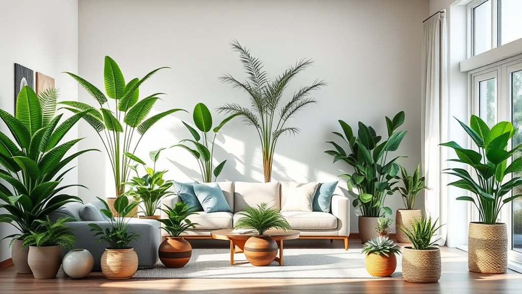 If you’re looking to enhance your space without the hassle of maintenance, I recommend exploring some of the best artificial indoor plants. These include realistic options like Monstera, palm trees, rubber trees, dieffenbachia, and dracaenas, all in various sizes and stylish pots. They’re easy to assemble, stable, and require no watering or pruning. Whether for home or office decor, these plants effortlessly bring greenery to your environment. Keep going, and you’ll discover the top choices to transform your space effortlessly.