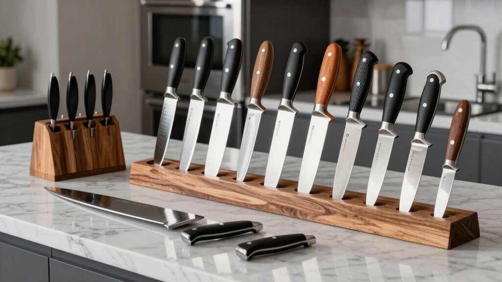 Effective storage and organization are essential to keeping your kitchen knife set in top condition and readily accessible. Good storage solutions like knife blocks, magnetic strips, or sheaths protect blades from dulling and damage. Self-sharpening knife blocks with built-in sharpeners guarantee your knives stay sharp with minimal effort. Drawer inserts and knife sleeves prevent blades from dulling or getting nicked when stored in drawers. Organized storage not only preserves your knives but also enhances safety by reducing the risk of accidental cuts. Additionally, consider the number and types of knives in your set to choose storage that fits everything comfortably. Proper organization makes it easy to find the right knife quickly, keeping your kitchen efficient and your blades in excellent shape.