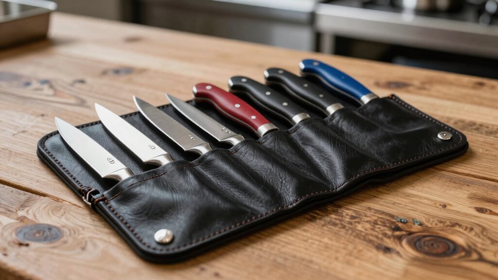 Knife rolls are designed with adjustable or specialized slots to fit various blade lengths and handle types. I appreciate how they often have elastic straps, padded compartments, or customizable inserts that securely hold different knives, whether they’re short paring knives or long chef’s blades. This flexibility guarantees my tools stay protected, organized, and easy to access, no matter the size or shape of my knives.