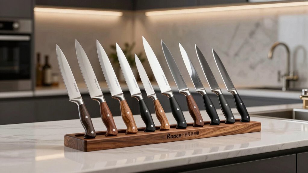 Imagine slicing through butter with a whisper—ceramic knives can do that. They’re incredibly sharp and lightweight, making them a great alternative within your budget. However, I’d warn you—they’re brittle and can chip or break if dropped. So, if precision and ease are your goals, ceramic might be your answer. Just handle them with care, and they’ll serve you well, adding a touch of elegance to your kitchen.