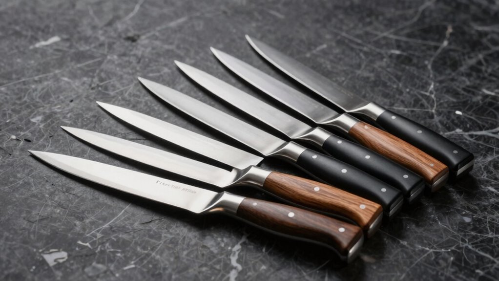 Since sharpness and edge retention are essential for effective meat preparation, selecting a knife with the right attributes can make all the difference. High-quality meat knives are usually sharpened to a 14-16 degree angle per side, offering excellent initial sharpness and precision. The steel’s hardness, reflected in a Rockwell score of 56+, plays a key role in balancing sharpness with durability. Razor-sharp blades need regular honing and sharpening with proper tools like sharpening rods to stay in top condition. Hand-forged knives, crafted meticulously with high-carbon steel, often excel in edge retention. Additionally, maintaining consistent cutting techniques and proper cleaning routines help preserve sharpness and extend the knife’s lifespan, ensuring ideal performance over time.