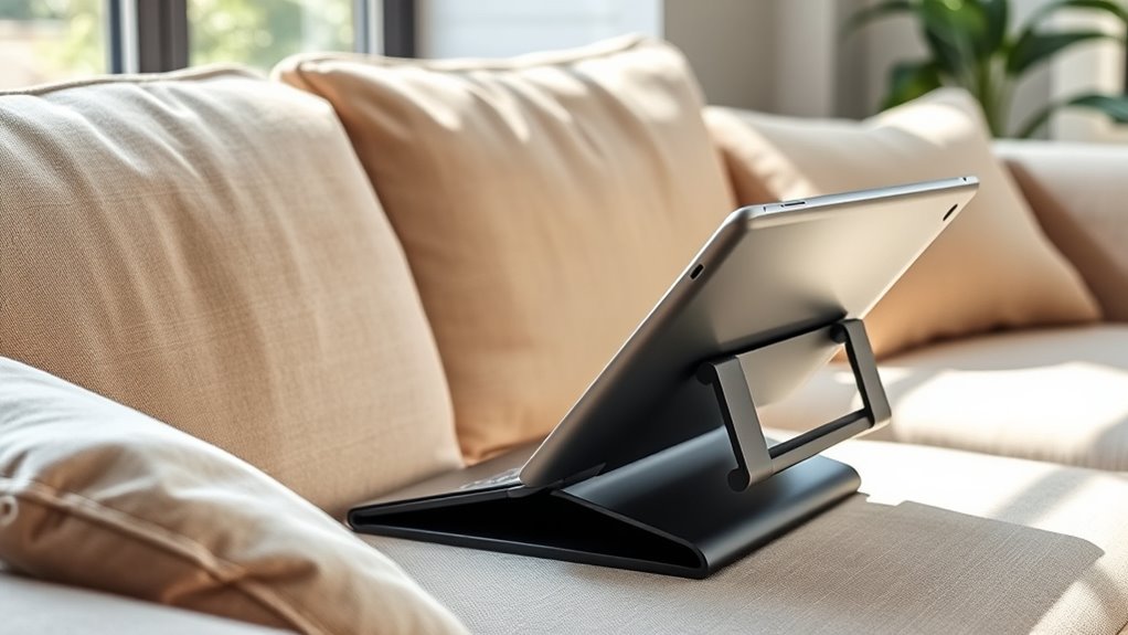 Ever wondered how to carry your lapstand effortlessly or store it without taking up too much space? A lightweight design, ideally under 2 pounds, makes it easy to transport and reduces fatigue. Foldable or collapsible models are perfect for compact storage, fitting easily into bags or backpacks. An adjustable height and angle feature enhances flexibility, allowing you to customize portability without sacrificing comfort. Materials like aluminum or lightweight alloys keep the lapstand durable yet light, making it suitable for on-the-go use. Plus, a small footprint—less than 12 inches in length and width—facilitates quick storage in drawers, laptop cases, or small spaces. These features ensure your lapstand is both convenient to carry and easy to stow away when not in use.