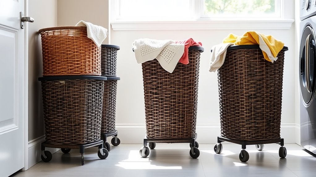 Ever considered how the type and size of wheels affect the ease of moving a laundry hamper? The right wheels can make a huge difference in maneuverability. Larger wheels, like 4-inch lockable casters, handle uneven surfaces and provide stability, while smaller, smooth-rolling swivel wheels make turning in tight spaces effortless. Locking mechanisms are vital—they keep the hamper steady during loading or unloading, preventing unwanted movement. The placement and number of wheels also matter; four or more evenly distributed wheels help balance heavy loads and improve stability. Additionally, handles—whether integrated or attached—work together with the wheels to make lifting and pulling easier. Choosing the right combination of these features ensures your laundry routine becomes more efficient and less of a hassle.