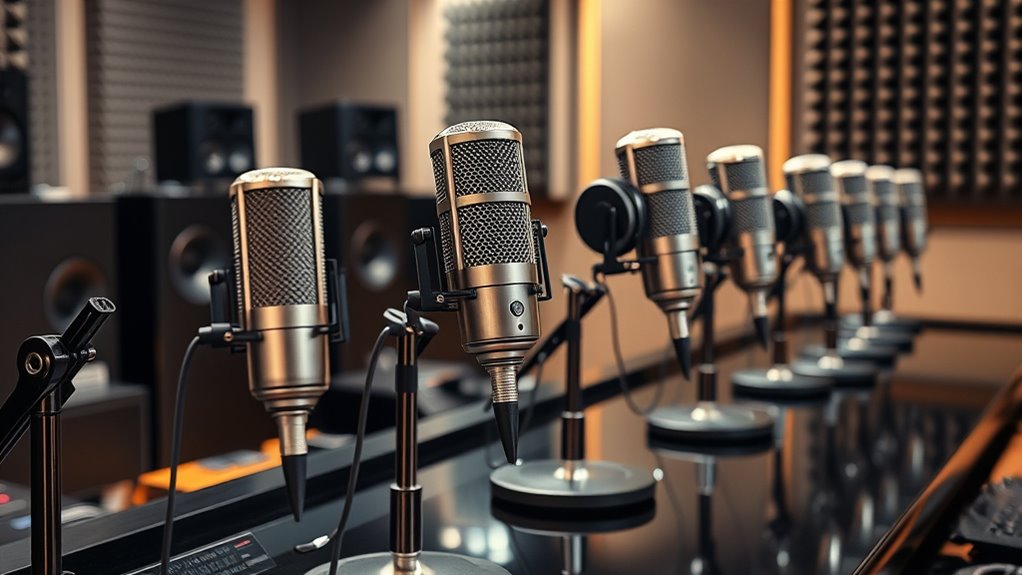 Choosing the right microphone for your podcast hinges on understanding the different types available and how they suit your recording environment. Dynamic microphones are great for noisy settings because their cardioid pattern reduces background noise and focuses on your voice. Condenser microphones, on the other hand, are more sensitive and have a wider frequency response, making them ideal for capturing detailed vocals in controlled spaces. If you’re just starting out, USB microphones offer a simple plug-and-play option, connecting directly to your computer without extra gear. XLR microphones typically need an audio interface or mixer but provide superior sound quality and room for upgrades. Also, consider polar patterns like cardioid for focused sound, omnidirectional for capturing multiple sources, or shotgun for distance recording.