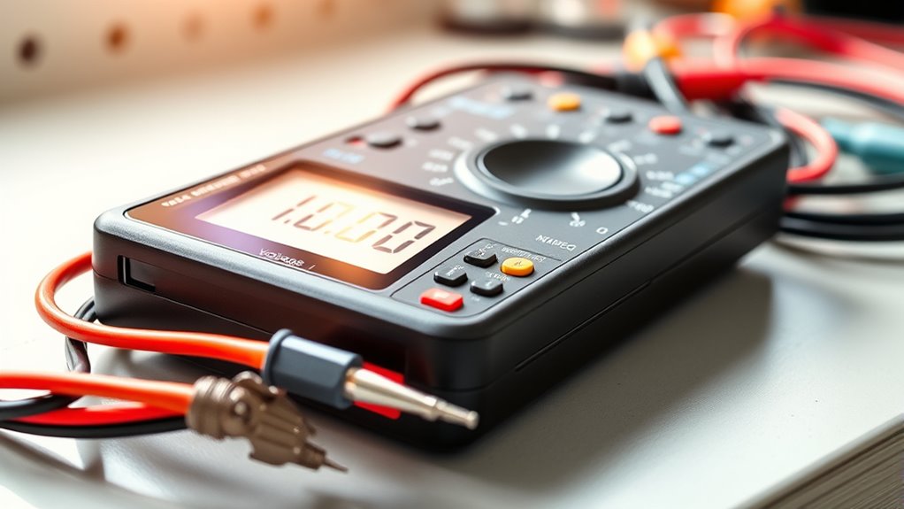 Ever wondered what makes a multimeter easy and safe to use at home? It all comes down to the user-friendly interface. A clear, easy-to-read display with large digits and backlighting guarantees I can see measurements even in low-light conditions. Simplified controls, like a single dial with intuitive symbols, help me switch modes quickly without confusion. Auto-ranging functions are a game-changer, eliminating the need to manually select measurement ranges and reducing errors. Built-in safety features such as overload protection and non-contact voltage detection make operation safer and more straightforward, especially for beginners. Additional features like data hold, auto shutoff, and ergonomic design enhance comfort and convenience. Overall, a user-friendly interface makes the process safer, faster, and less intimidating.