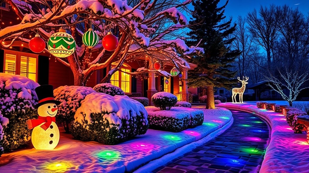 If you want to make your yard festive and bright, I recommend a mix of durable outdoor lights, large decorations, and fun inflatables. The best options include waterproof pathway lights, a stunning nativity scene, a colorful LED snowman flag, solar Christmas trees, inflatable Santa, and festive moose figures. These create a lively, magical outdoor space that everyone will enjoy. Keep exploring to discover even more creative ideas and tips for a truly dazzling holiday display.